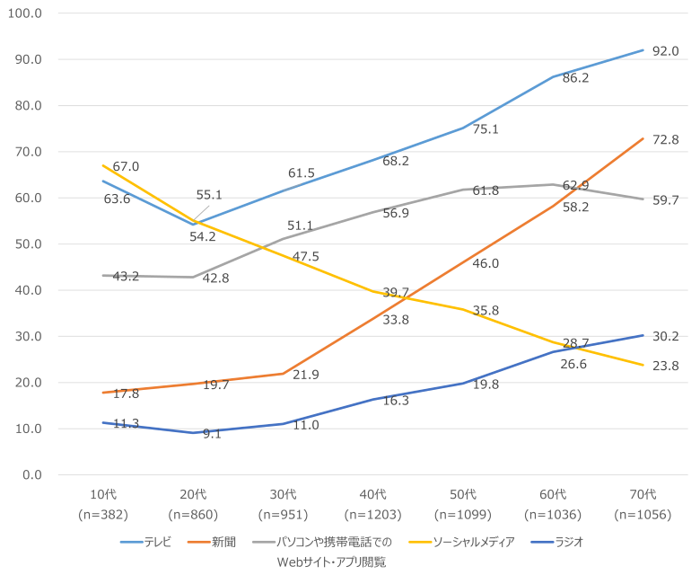 年齢が高くなるにつれ、「ソーシャルメディア」の使用は少なくなるが、逆に「新聞」を読んでいる割合は増加する。また、70代では約3割の人が「ラジオ」を聞いており、根強い人気がうかがえる。