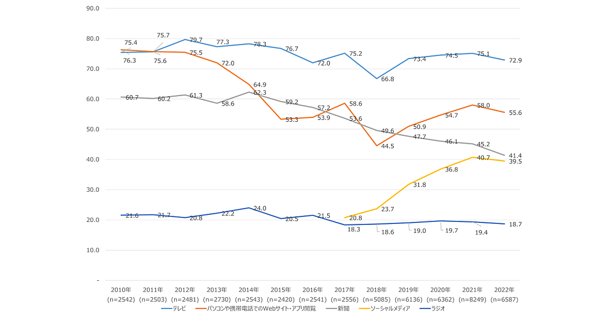 調査によると、2022年現在でも「テレビ」の利用が最も多いことが分かった。2010年からの推移を見ても、毎年約7割の人がテレビから日常的にニュース情報を得ていることがわかる。
