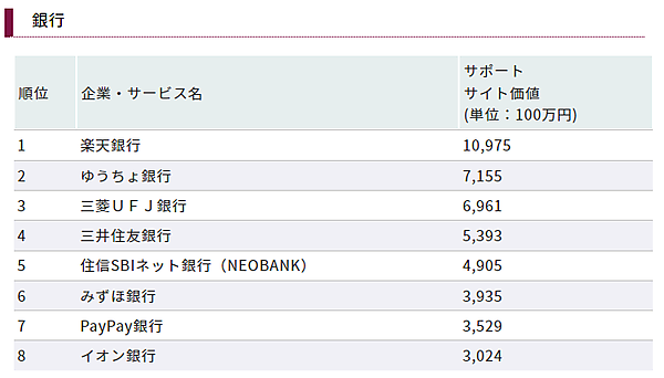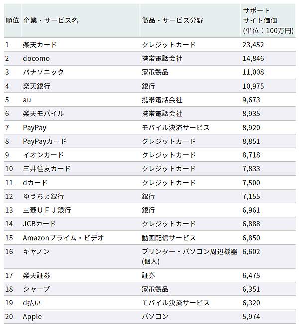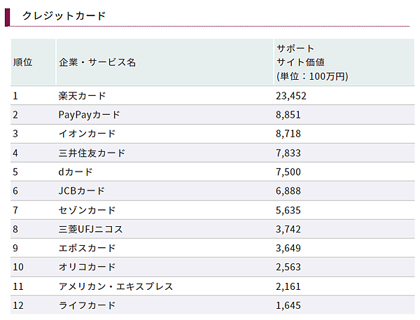その他、「クレジットカード」「銀行」「携帯電話会社(通信キャリア)」のランキング上位およびそのサポートサイト価値は、以下のとおり。