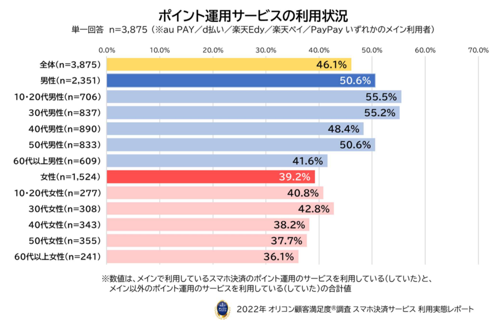 性別、年代別に見ると、男性では50.6%、女性では39.2%の人がポイント運用をしたことがあると回答し、特に10、20代の男性では55.5%にのぼった。