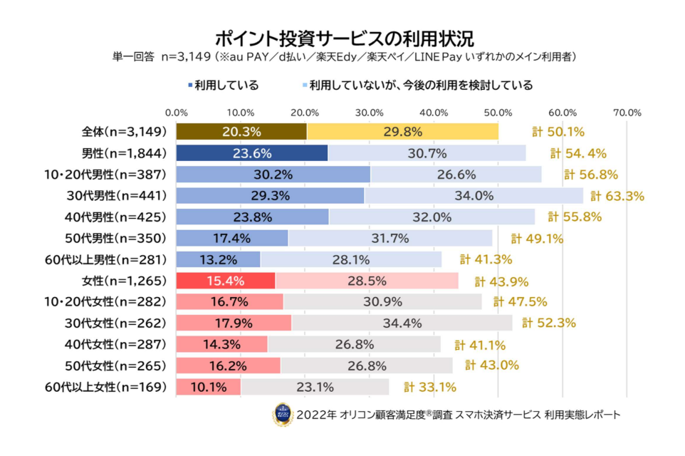 続いて、実際に証券会社で金融商品を購入する際にポイントを利用することが可能な「ポイント投資」サービスを提供している「au PAY/d払い/楽天Edy/楽天ペイ/LINE Pay」 のいずれかを利用している3,149人を対象に、「メインで利用しているスマホ決済を利用して獲得したポイントを、ポイント投資に利用していますか」と聞いたところ、全体の20.3%が「利用している」と回答した。また、「利用していないが、今後の利用を検討している」は29.8%となった。