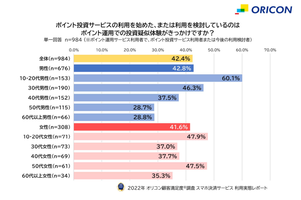 また、ポイント運用サービスとポイント投資サービスをともに利用している回答者984人を対象に、「あなたがポイント投資を利用、または今後の利用を検討しているのは、ポイント運用での投資疑似体験がきっかけですか」と聞いたところ、全体では42.4%が「はい」と回答した。性年代別に見ると、10・20代男性が60.1%と最も多い結果となった。