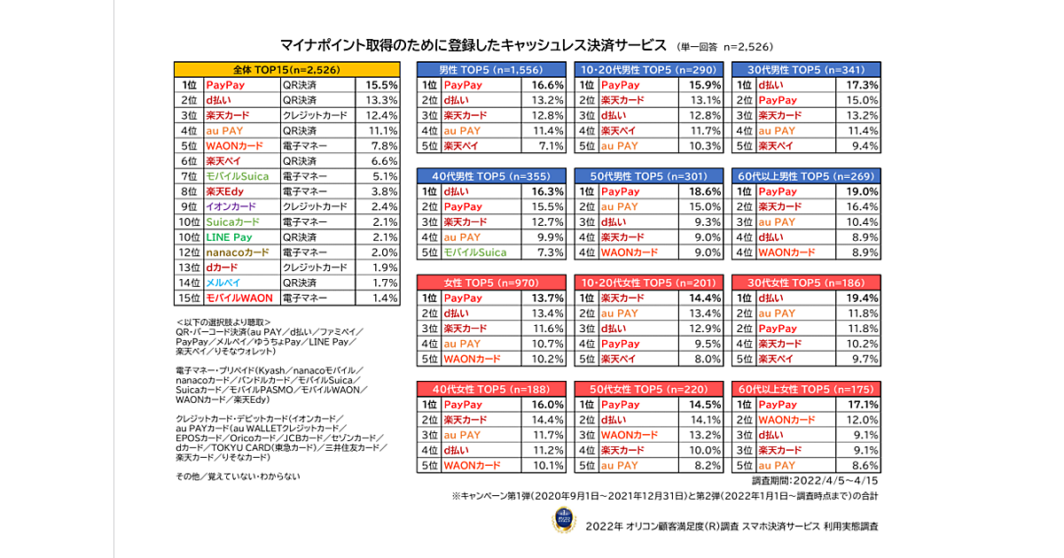 oricon ME(オリコン エムイー)は、「スマホ決済サービス」の満足度調査を実施した。全国の18~84歳の男女5,097人を対象に、「マイナポイント取得のために登録したキャッシュレス決済サービス」、またスマホ決済サービスの「ポイント運用サービス」の利用状況を聞いている。