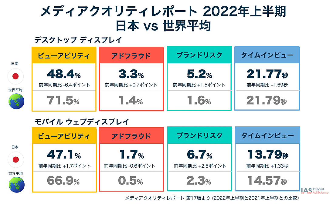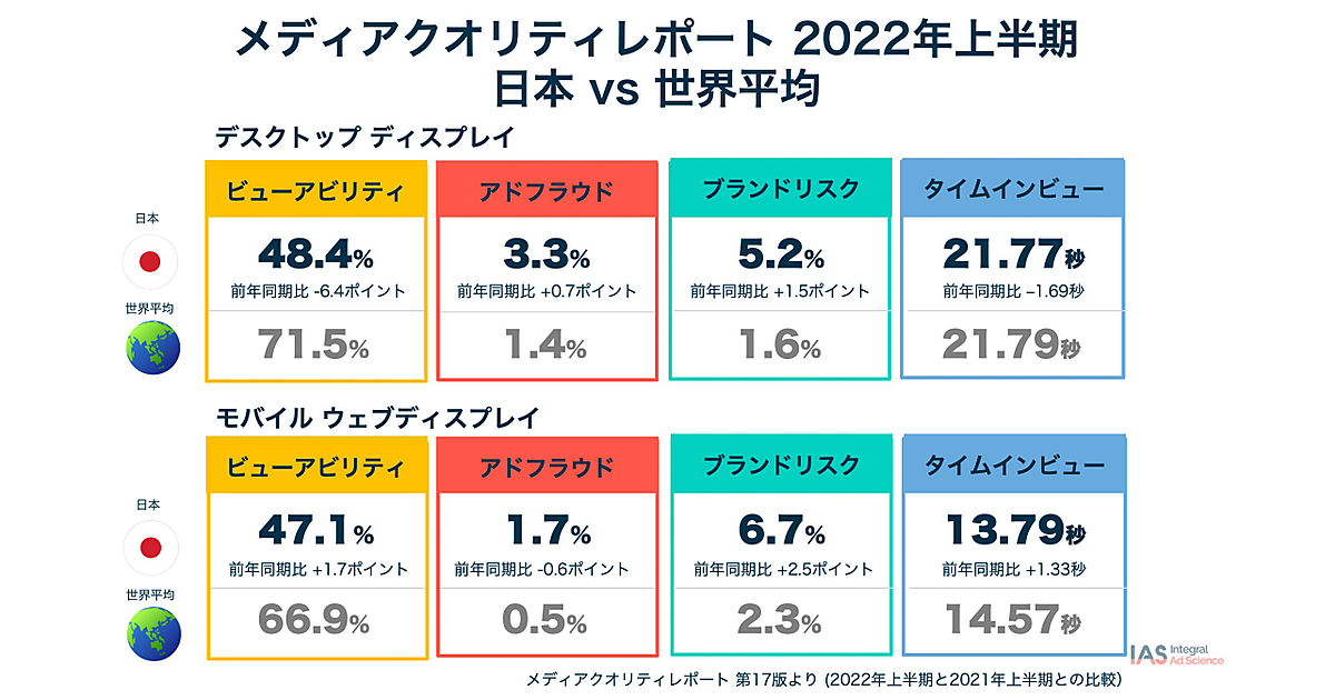 インテグラル アド サイエンス(IAS)は、「メディアクオリティレポート 最新版[2022年上半期:1月~6月]」を発表した。アドフラウド、ブランドリスク、ビューアビリティなど、デジタル広告の主要カテゴリにおけるパフォーマンスを世界的に計測したもので、年2回発行されている。