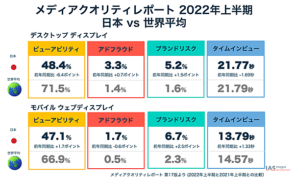 今回の調査では、アドフラウド、ブランドリスク、ビューアビリティなどの指標において日本は、世界平均に比べかなり数字が悪い状況が明らかとなっている。