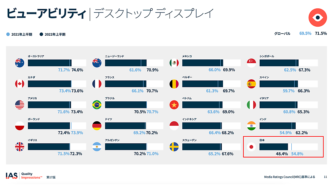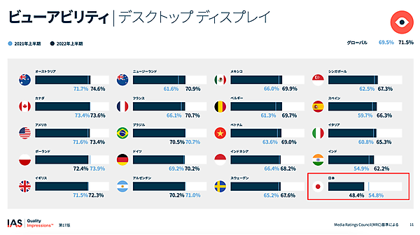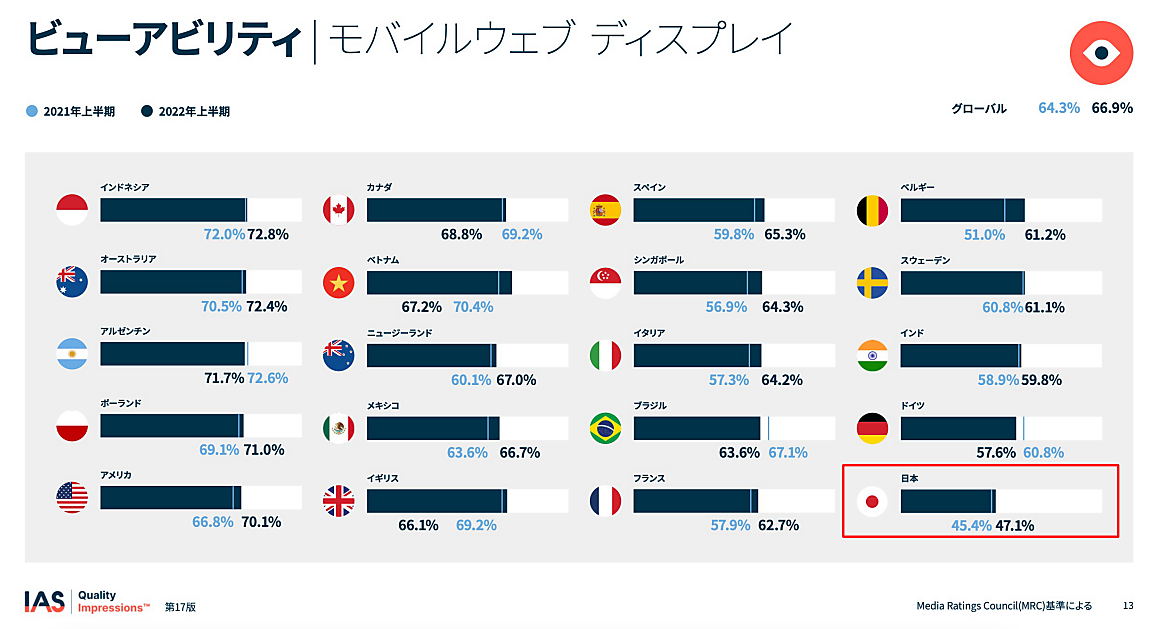 なおモバイルウェブでのビューアビリティは、日本も前年同期比1.7ポイント増で47.1%と改善したが、世界平均66.9%をまだまだ下回っている。