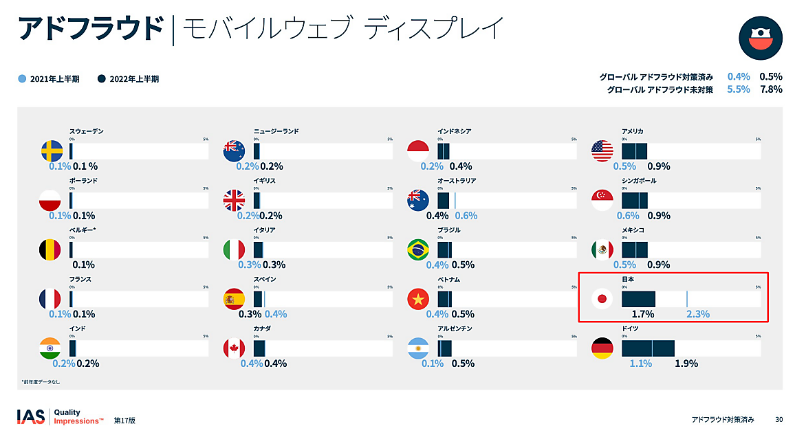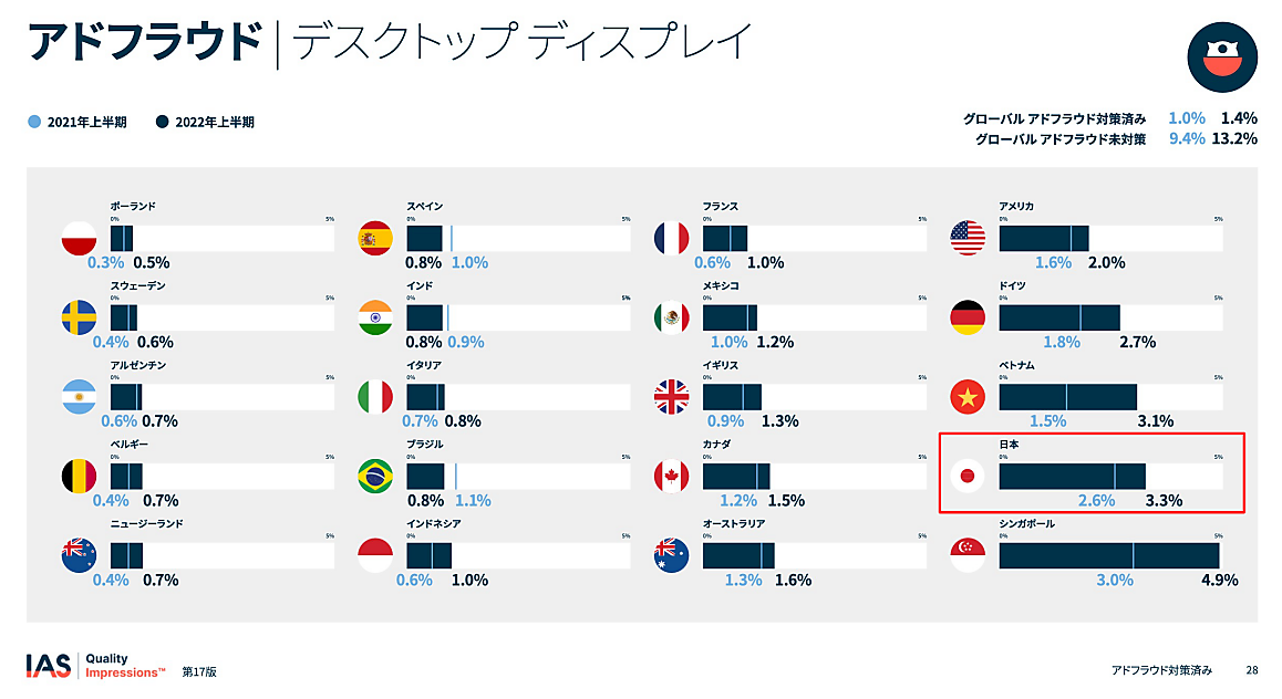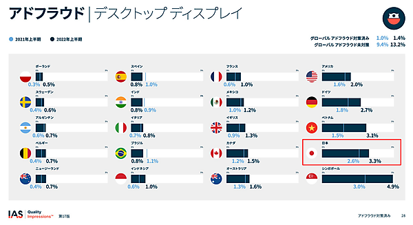 一方2022年上半期の「アドフラウド(広告不正)」は、ほとんどの国で増加。日本のデスクトップ ディスプレイ広告のアドフラウドも前年同期の2.6%から3.3%に増加し、シンガポール(4.9%)に続くワースト2位となった。モバイルウェブのディスプレイ広告のアドフラウドは2.3%から1.7%に改善したが、いまだ世界ワースト2位だ。
