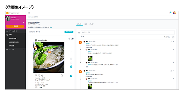 ②は投稿作成画面でチャット形式でやり取りできる機能。修正や確認が必要な部分をポインターで示すことで認識の食い違いを防止しながらスムーズで効率的なコミュニケーションが可能になる。Engage ManagerはInstagramと「Twitter」「Facebook」「YouTube」に対応し、複数ユーザーで各ソーシャルメディアのアカウントが管理できる。