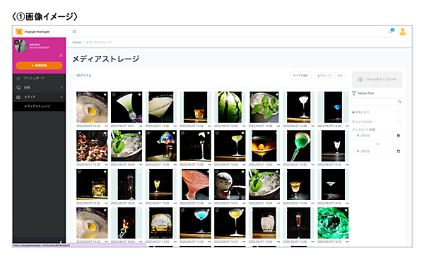①はEngage Manager上で画像素材の受け渡しが可能な機能。トリミング作業もEngage Manager上でできる。画像素材のやり取りで多かったメール添付や別ツールへのアップロード後に制作関係者にダウンロードしてもらうという手順が省け、作業が効率化する。今後は、外部の関係者が画像をアップロードできる機能の実装も予定している。