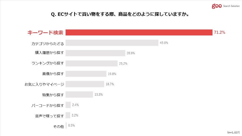 次に、「ECサイトで商品を探す方法」について聞くと、「キーワード検索」が71.2%と最多で、2位の「カテゴリからたどる」とは20ポイント以上の差をつける結果となった