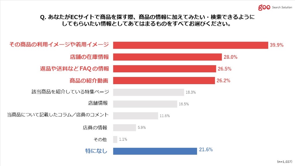 また、「ECサイトで商品を探す際に、商品情報以外に見たい・検索したいと思う情報」について質問したところ、「商品の利用イメージや着用イメージ」が39.9%と最も多く、以下「店舗の在庫情報」「返品や送料などのFAQ」「商品の紹介動画」と続いた。