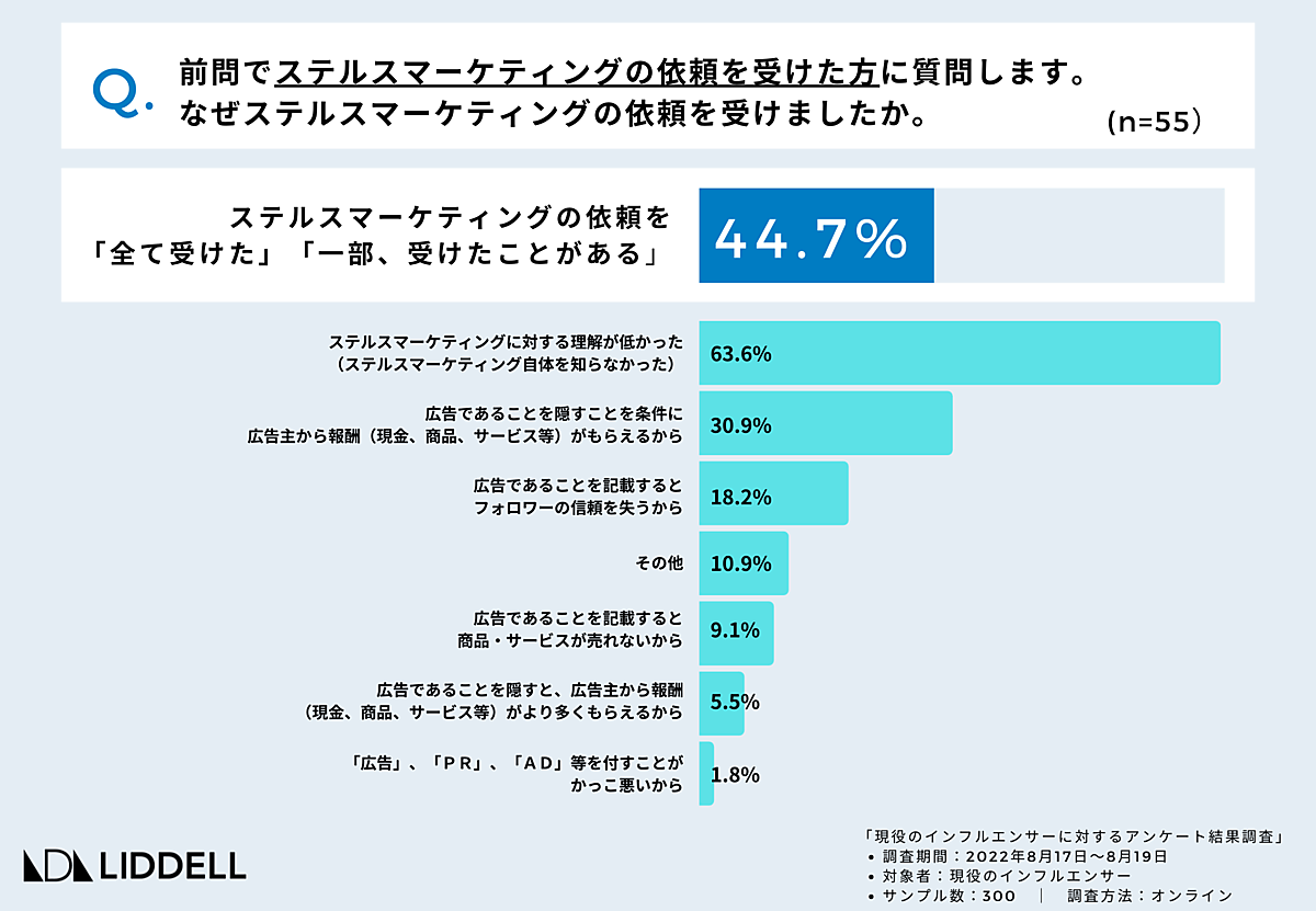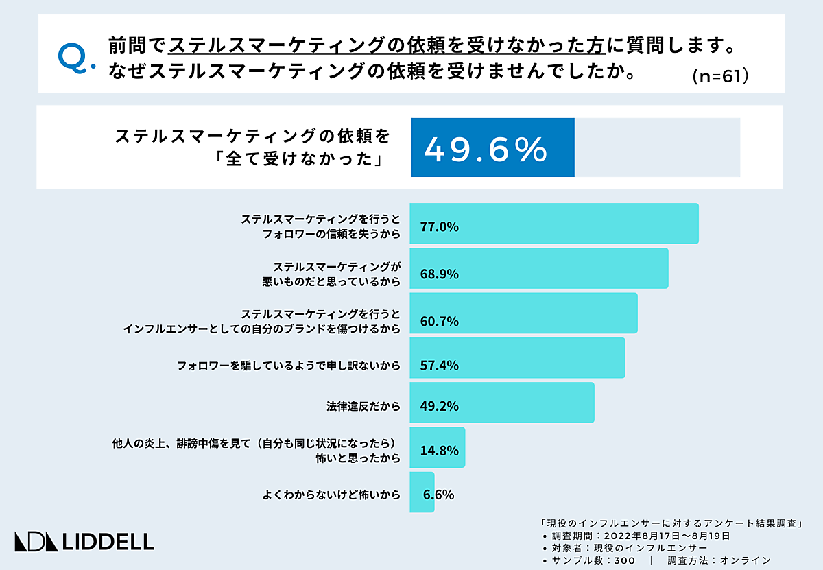 逆に依頼を受けなかった人たち(61人)に「なぜ依頼を受けなかったか」を聞くと、「フォロワーの信頼を失うから」77.0%がとくに多いが、「ステマが悪いものだと思っているから」68.9%、「ステマを行うと自分のブランドを傷つけるから」60.7%も多く、ステマの危険性を熟知しているインフルエンサーが多かった。また「法律違反だから」と、明確に脱法行為だと認識しているインフルエンサーも49.2%存在した。