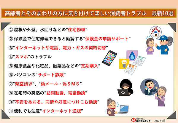 国民生活センターは9月19日の敬老の日に合わせ、「高齢者とそのまわりの方に気を付けてほしい消費者トラブル 最新10選」を発表した。全国の消費生活センターなどに寄せられた相談・公表資料などから、特に気を付けてほしい消費者トラブルについてまとめた内容となっている。