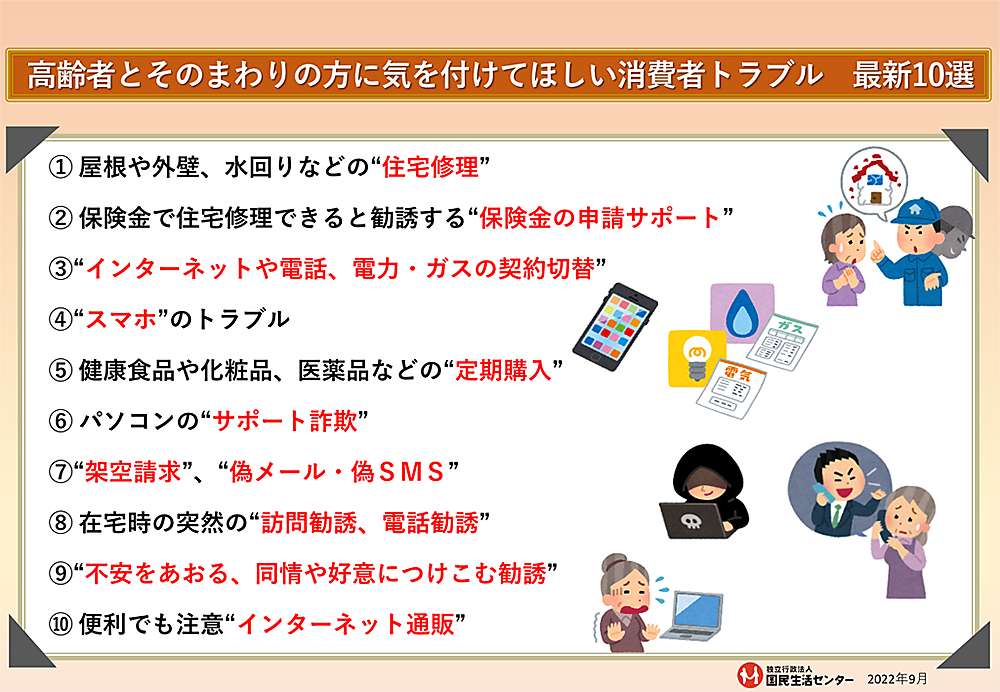 「高齢者とそのまわりの方に気を付けてほしい消費者トラブル 最新10選」として発表されたのは以下の10項目だ。