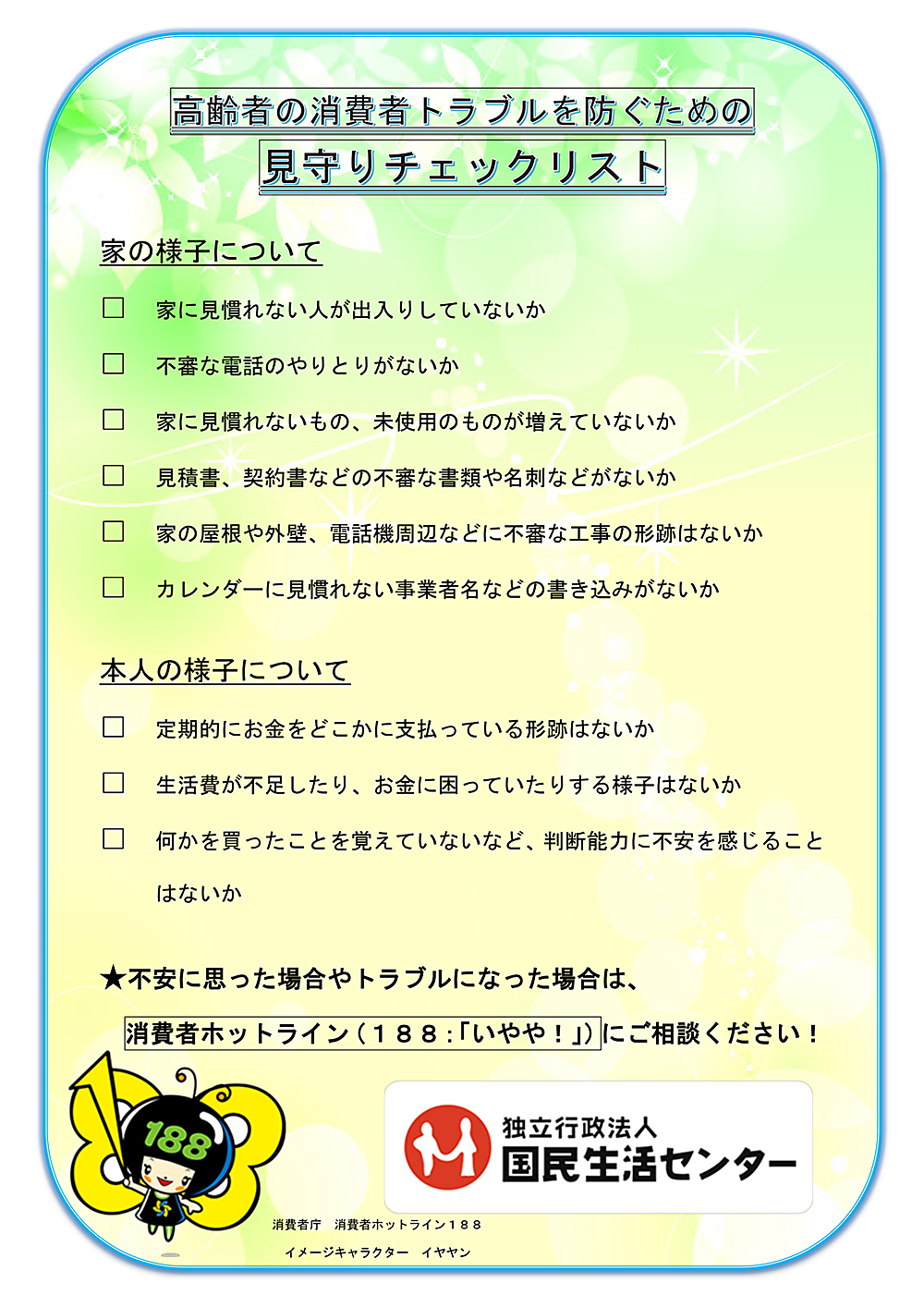 さらに身近な高齢者の様子において、「家に見慣れない人が出入りしていないか」「不審な電話のやりとりがないか」「不審な書類や名刺などがないか」「カレンダーに見慣れない事業者名の書き込みがないか」といった、見守りの際の注意点をリストアップしたデータを公開している。