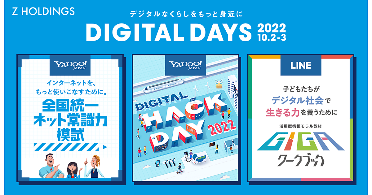 DIGITAL DAYS 2022ではヤフーが「全国統一ネット常識力模試」、日本のデジタル化の課題や最新技術を踏まえた作品を24時間で開発する「Digital Hack Day 2022」、「Yahoo!防災速報」の「災害マップ」機能などを提供。LINEは小中学生向けの情報モラル教材や、本人確認が必要な行政手続きが「LINE」でできる「LINE Pay公的個人認証サービス」などを掲載した。