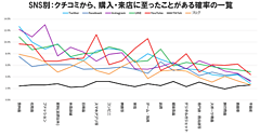 次に、上記の8つのSNSと19のジャンルごとにクチコミが購入・来店に与える影響を調査した。