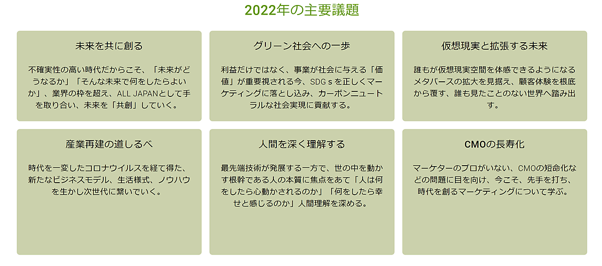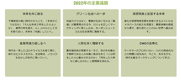 コーヒーブレイクやネットワーキングランチをなど、多くの交流の時間を挟みながら、基調講演・ケーススタディープレゼンテーション・パネルディスカッションを通じ、以下の2022年の主要課題6つをテーマに活発な議論を行う。