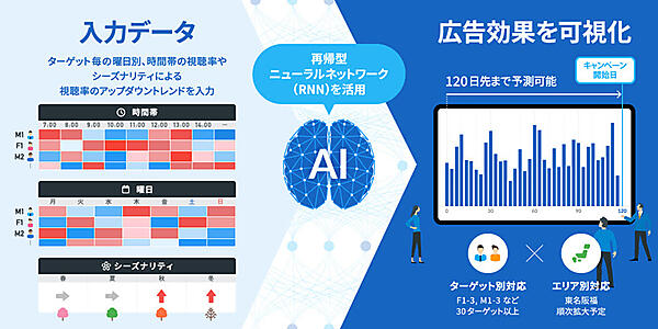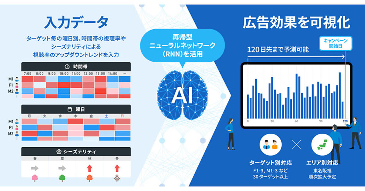 電通と、電通グループ傘下でAI(人工知能)開発・マーケティングコンサルティング事業のデータアーティストは、AIを活用したテレビ視聴率予測システム「SHAREST(シェアレスト)」の新バージョン「SHAREST_LT」の提供を9月30日に始めた、と同日発表した。120日先の長期(LT=Long-term)の予測が可能。対象は30ターゲット以上で東京、大阪、名古屋、福岡地域に対応する。