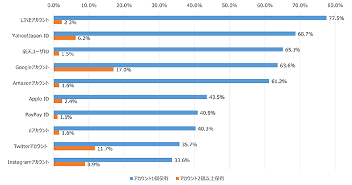 2個以上所有しているアカウントについては、「Googleアカウント」17.0%が最多。以下「Twitterアカウント」11.7%、「Instagramアカウント」8.9%とSNS系が並んだ。GoogleアカウントはGmailのために所有しているケースが多いと推測される。