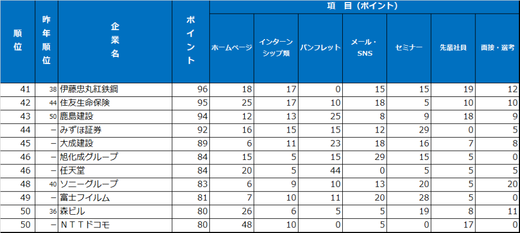 ホームページ(ウェブ)ランキングでは、「三井物産」が4年ぶりの1位となり、「デザインが格好よく、業務ケースがよく学べた」と高く評価された。2位の「三井住友銀行」は、「デザインが革新的。動画やインタビューなど、業務・社風理解につながるコンテンツが豊富」とデザイン性や豊富な情報量を評価する声が多く聞かれた。