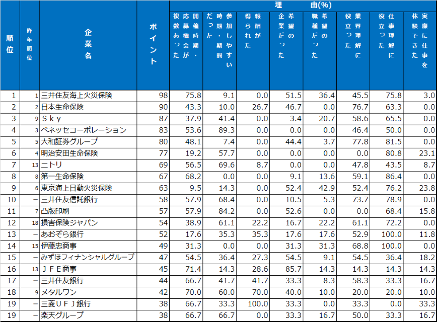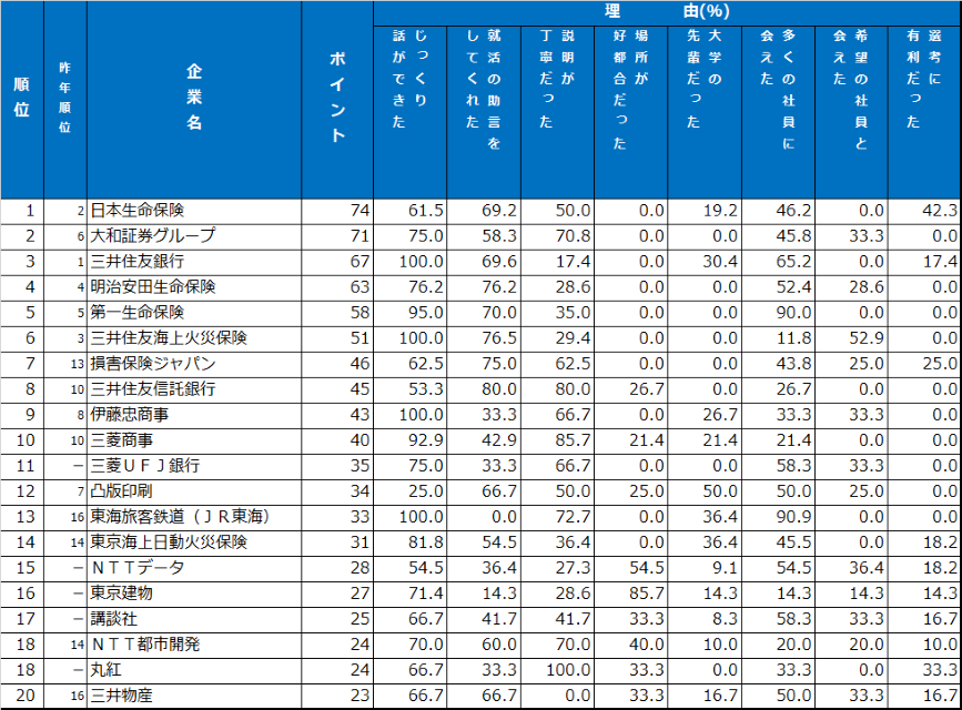 1位の日本生命保険は「多くの社員からアドバイスをもらえた」「仕事内容や社風に対する理解を深めながら選考を進めることができた」と高評価。2位の大和証券グループは「質問に対して真摯に、丁寧に答えてくれた」「じっくり話ができた」といった面で学生の支持を集めた。