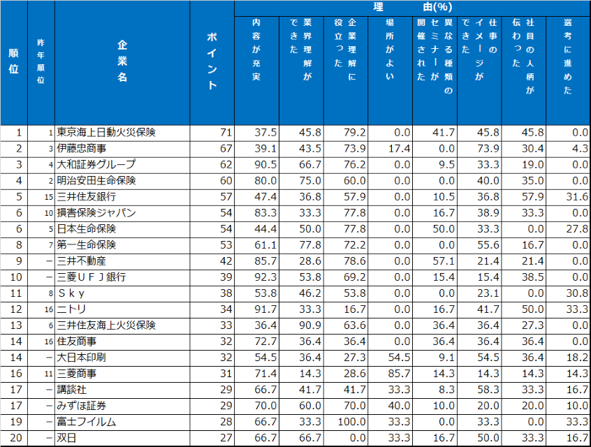 セミナー・説明会において人気を集めた企業は、時期に応じて多種多様なセミナーを開催しているようだ。1位の「東京海上日動火災保険」は「何度もセミナーに参加した。業界・企業研究に役立つ内容ばかりで非常に助かった」「女性のキャリアに特化したセミナーがあった」とのコメントが寄せられた。