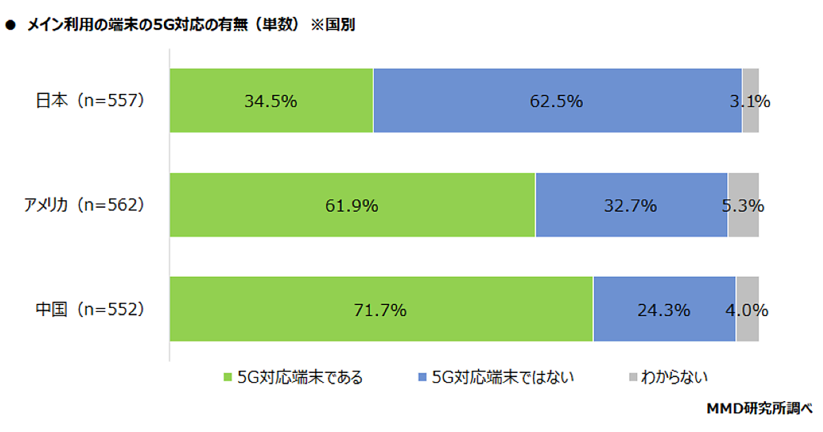 メインで利用している端末の5G対応の有無を聞いたところ、日本では34.5%、アメリカでは61.9%、中国では71.7%が「5G対応端末」であることが明らかになった。