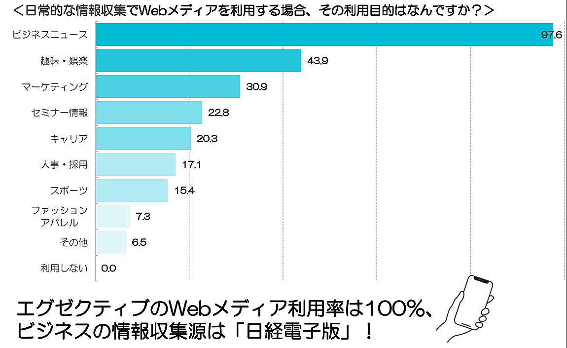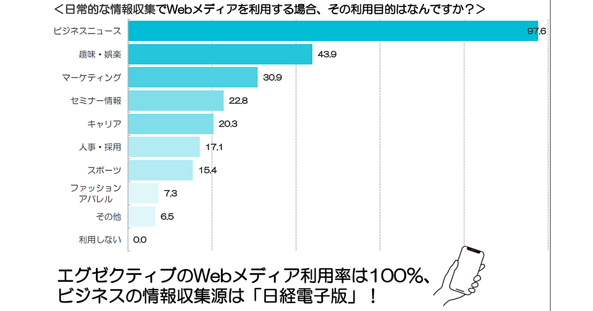 まず「日常的な情報収集でWebメディアを利用する場合、その利用目的はなんですか?」と聞くと、「ビジネスニュース」97.6%が圧倒的に多い。以下、かなり数字が離れて「趣味・娯楽」43.9%、「マーケティング」30.9%が続く。少数だが「スポーツ」「ファッション・アパレル」なども趣味とは別にあがっている。