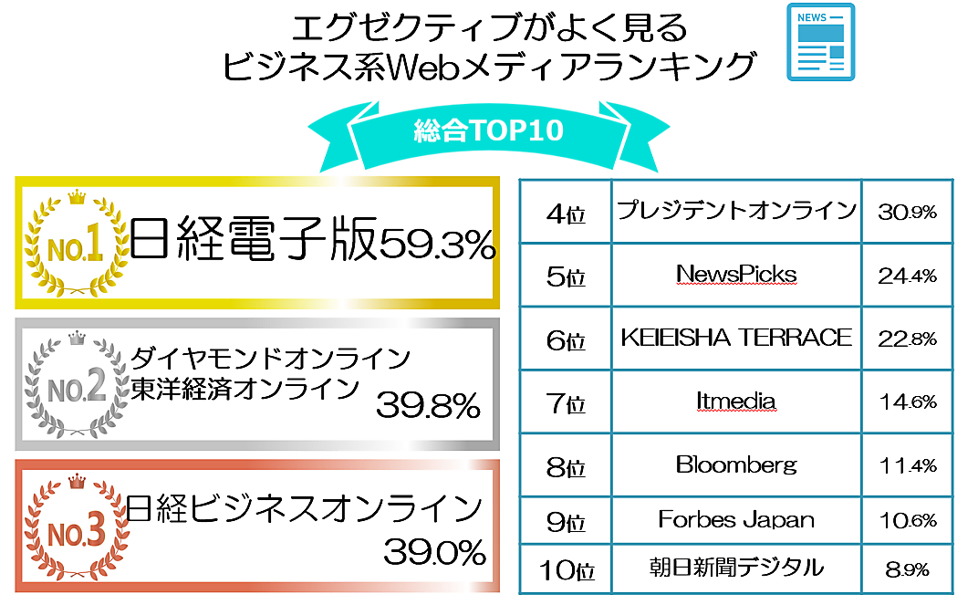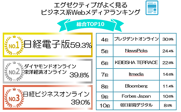 「よく見るビジネス系Webメディア」では、「日経電子版」59.3%、「ダイヤモンド・オンライン」「東洋経済オンライン」各39.8%、「日経ビジネスオンライン」各39.0%が上位だった。日経のメディアは1位と3位に2つランクインしており支持が高い。