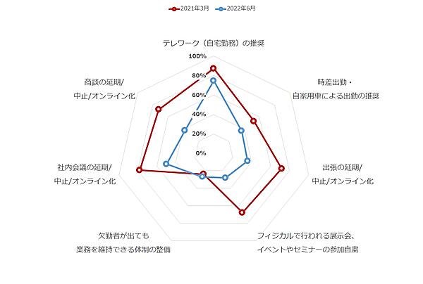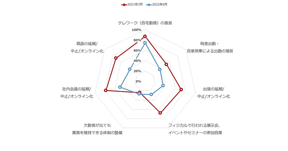 コロナ禍における職場や働き方について、ほぼ1年前の2021年3月調査(企業対応がピークにあったとされる時期)と比較すると、「出張の延期/中止/オンライン化」「フィジカルで行われる展示会、イベントやセミナーの参加自粛」が50ポイント近く減少するなど、大幅に制限が緩和されていることが判明した。「社内会議の延期/中止/オンライン化」「商談の延期/中止/オンライン化」も大きく減少しており、質問項目のなかでは唯一「欠勤者が出ても業務を維持できる体制の整備」のみが増加していた。