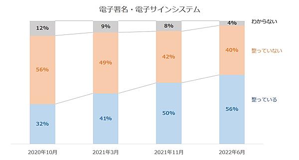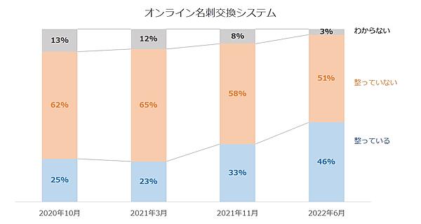 テレワーク(自宅勤務)については、2020年10月以降、8割超の企業で整備されている状況で推移しており、コロナ禍でのテレワーク定着が伺える。個別のシステムでは「電子署名・電子サインシステム」「オンライン名刺交換システム」の整備が、ここ1、2年で急伸している。