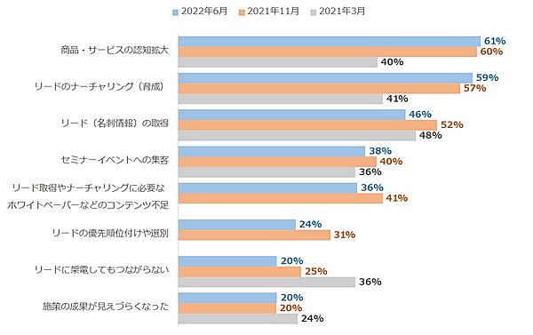 さらに「今後のマーケティング課題」について聞くと、2021年3月調査では「リード(名刺情報)の取得」を挙げた回答者の割合がもっとも多かったが、以降は「商品・サービスの認知拡大」「リードのナーチャリング(育成)」が急増し上位へと変化した。これは受取手側もワークスタイルが変化し、情報収集方法が変化したためと考えられる。