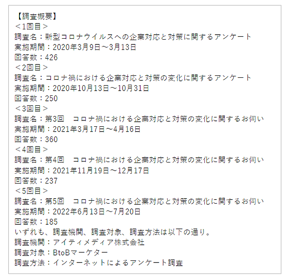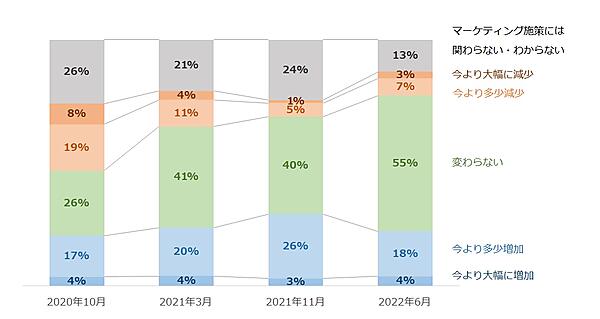 アイティメディアの「デジマ調査ラボ」は、「コロナ禍における勤務環境やマーケティング施策に関する調査」の結果を公開した。2020年3月よりほぼ半年ごとにBtoBマーケターを対象に実施している調査で、今回で5回目となる(2020年3月、2020年10月、2021年3月、2021年11月、2022年6月)。