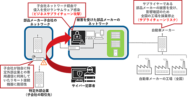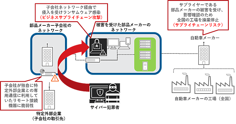 この事例では、リモート接続機器の脆弱性を悪用され、自動車部品を製造する企業がランサムウェア攻撃を受けた。その結果、製造部品の納入先である大手自動車メーカーまで、全国工場の操業を停止させる事態となった。