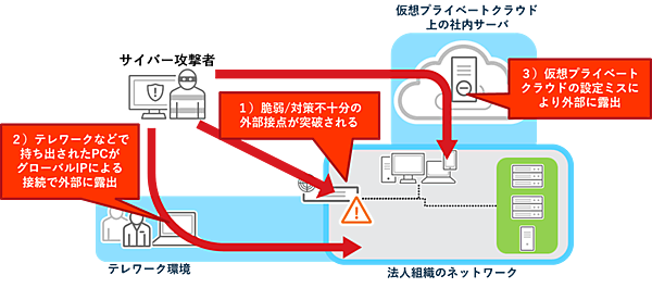 - 仮想プライベートクラウドに移行した内部向けサーバが、設定ミスにより外部からもアクセス可能なことによる侵入。