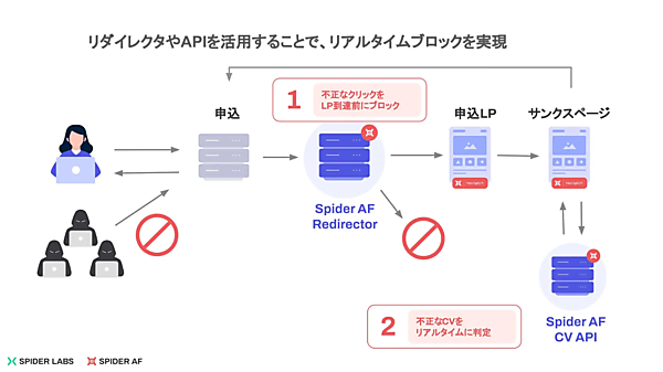 不正コンバージョンブロッカーは、Spider Labのデータ解析技術を活用し、不正なユーザーや申し込みをリアルタイムに検知してブロックする。企業とSpider AFのAPIを連携すると、企業の管理画面に情報を反映したり、チャットツールやメールで不正ユーザーを通知したりできる。不正を起こしたデータの分析によって、その後の不正成果を登録時点で防ぐ。