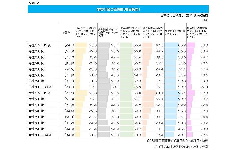 最後に「お金に対する価値観・消費行動」を聞くと、男女16~19歳・20代の若年層では「趣味や好きなものに対しては、糸目をつけずにお金を使う」「将来のことは意識せず、いまを楽しむためにお金を使いたい」「購入時はみんなが持っているものやランキングを参考にする」などが他と比べて高い。一方、男女70代以上では「多少価格が高くても品質が良いものを買う」が高かった。
