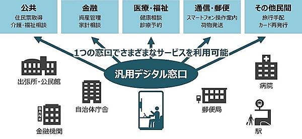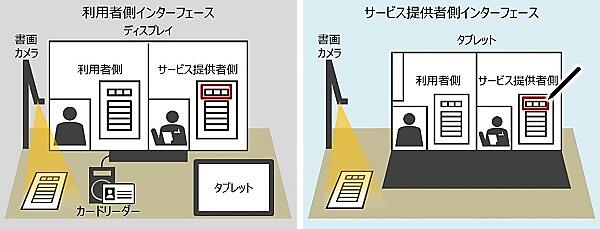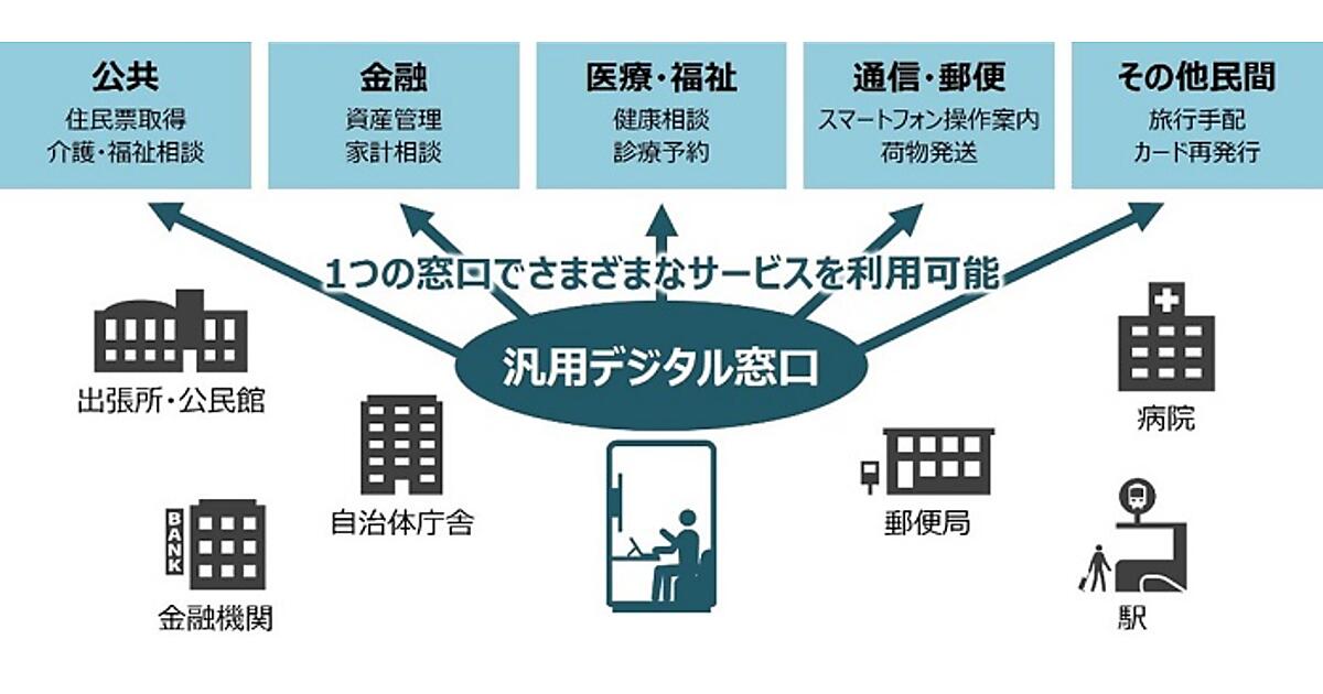 公共と民間にまたがる複数の窓口サービスを生活圏内で提供する。行政だけでなく銀行や交通事業者、医療機関、旅行代理店などさまざまな窓口サービスと接続できる利用ブースを地域の身近な場所に設置。オンラインで手軽に複数サービスが利用でき、役所から離れたエリアの住民や移動制約者の負荷を低減する。ビデオ通話で表情を確認する会話と、高精細な書画カメラで机上書類を共有して対面さながらの相談や手続を支援する。