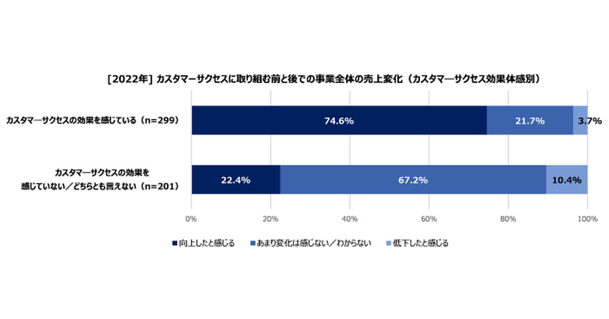 まず、事業全体の売上変化について聞いたところ、カスタマーサクセスの効果を感じている人の74.6%が「売り上げが向上した」と回答した。効果を感じていない人/どちらとも言えない人では67.2%の人が「あまり変化は感じない/わからない」と回答していた。