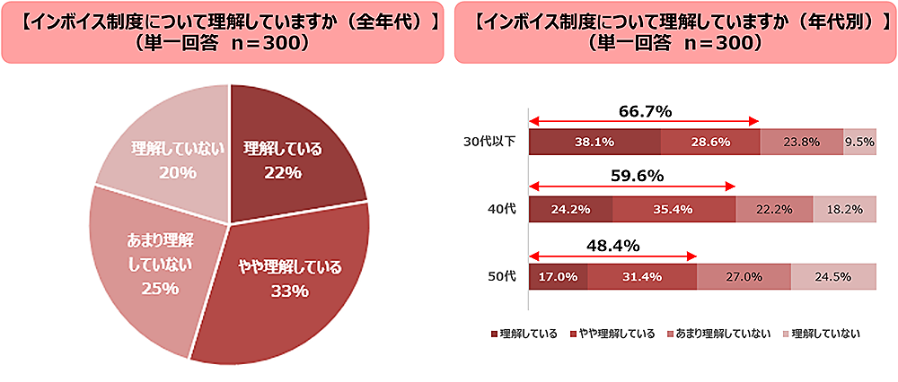 ITフリーランス300人に「インボイス制度の理解度」を尋ねると、「理解している」22%、「やや理解している」33%で、計55%が理解している状態だった。年代別では、若い世代ほど「理解している+やや理解している」の割合が高く、30代以下では66.7%が「理解している+やや理解している」だったが、50代は48.4%と半数未満だった。