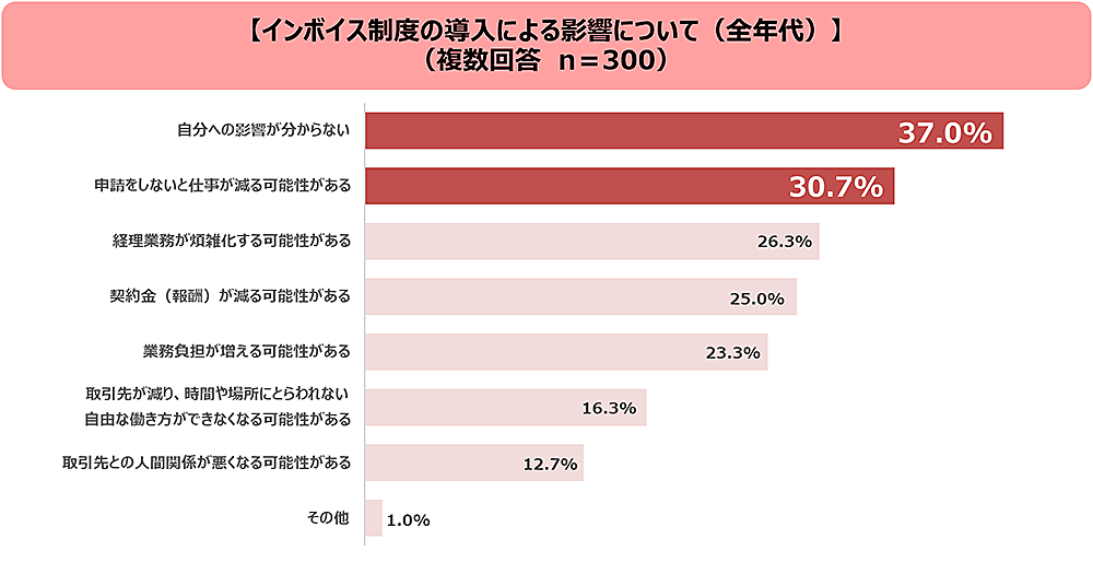 「インボイス制度の導入により、自分にどのような影響があると思うか」を聞くと、そもそも「自分への影響がわからない」37.0%という人が最多だった。さらに「申請をしないと仕事が減る可能性がある」30.7%と、不安を抱いている人も多い。