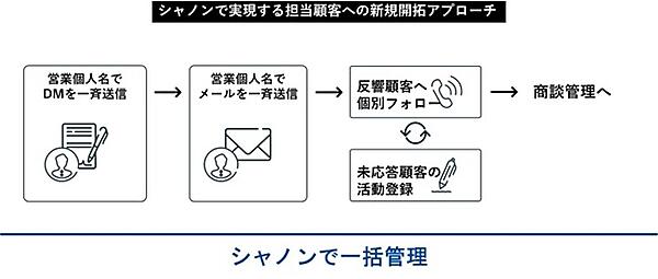 MAと一体化しているため顧客・企業の行動履歴が一元管理でき、顧客を深く理解したうえで営業アプローチが可能になる。商談中の顧客がウェブサイトにアクセスした際に営業担当者にメールで通知したり、営業個人名でダイレクトメール(DM)やメールを一斉配信して反応があった顧客にだけ電話をかけたりするなど、商談創出につなげられる。
