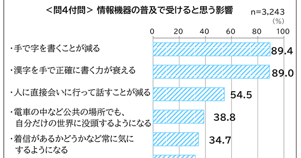 具体的な影響では「手で字を書くことが減る」89.4%、「漢字を手で正確に書く力が衰える」89.0%が上位だが、「人に直接会いに行って話すことが減る」54.5%、「電車の中など公共の場所でも、自分だけの世界に没頭するようになる」38.8%など、個人の能力だけでなくコミュニケーションの在り方に危惧を抱いた回答も多かった。