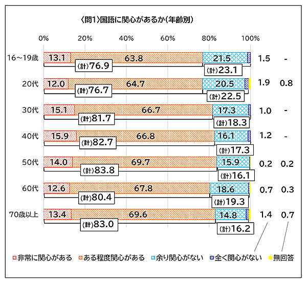 まず「国語(日本語)に関心があるか」(日常の言葉遣いや話し方、文章の書き方など)を聞くと、「非常に関心がある」13.9%、「ある程度関心がある」68.0%で、約8割が関心を持っていたが、「全く関心がない」1.0%、「余り関心がない」16.8%という層も存在した。年齢別で見るとおおむね若い層ほど関心が低い。