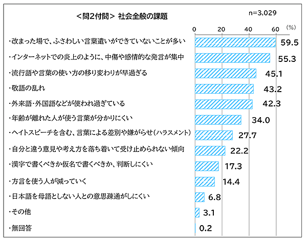 なお「言葉や言葉の使い方について、社会全般で、課題があると思うか」を聞くと、84.6%が「あると思う」と回答している。具体的な社会全般の課題としては「改まった場で、ふさわしい言葉遣いができていないことが多い」59.5%が最も多い。