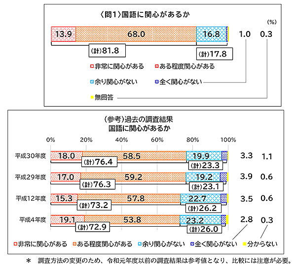 この調査では「国語に対する関心」「言葉や言葉の使い方の課題」「生活の変化とコミュニケーション」「ローマ字表記」「新しい言葉の使用と印象、慣用句等の意味・言い方」を中心に、日本人の国語に関する意識や理解について、幅広くアンケートを行っている。