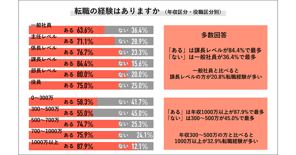 全体の約7割が「転職経験あり」。年収1,000万円以上では9割弱