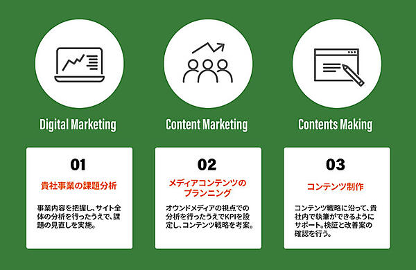 メディアコンサルティングサービスは①事業の課題分析②メディアコンテンツのプランニング③コンテンツ制作--の3段階。①で事業内容の把握とサイト全体の分析で課題を見直し、②でKPI(重要業績評価指標)を設定してコンテンツ戦略を検討。③では企業の担当者が執筆できる編集体制を構築して記事作成を支援するとともに検証・改善する。
