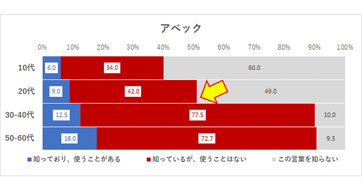 まず「アベック」という単語は年齢が下がるとともに認知・利用も下がり、20代以下・30代以上に壁が存在する。